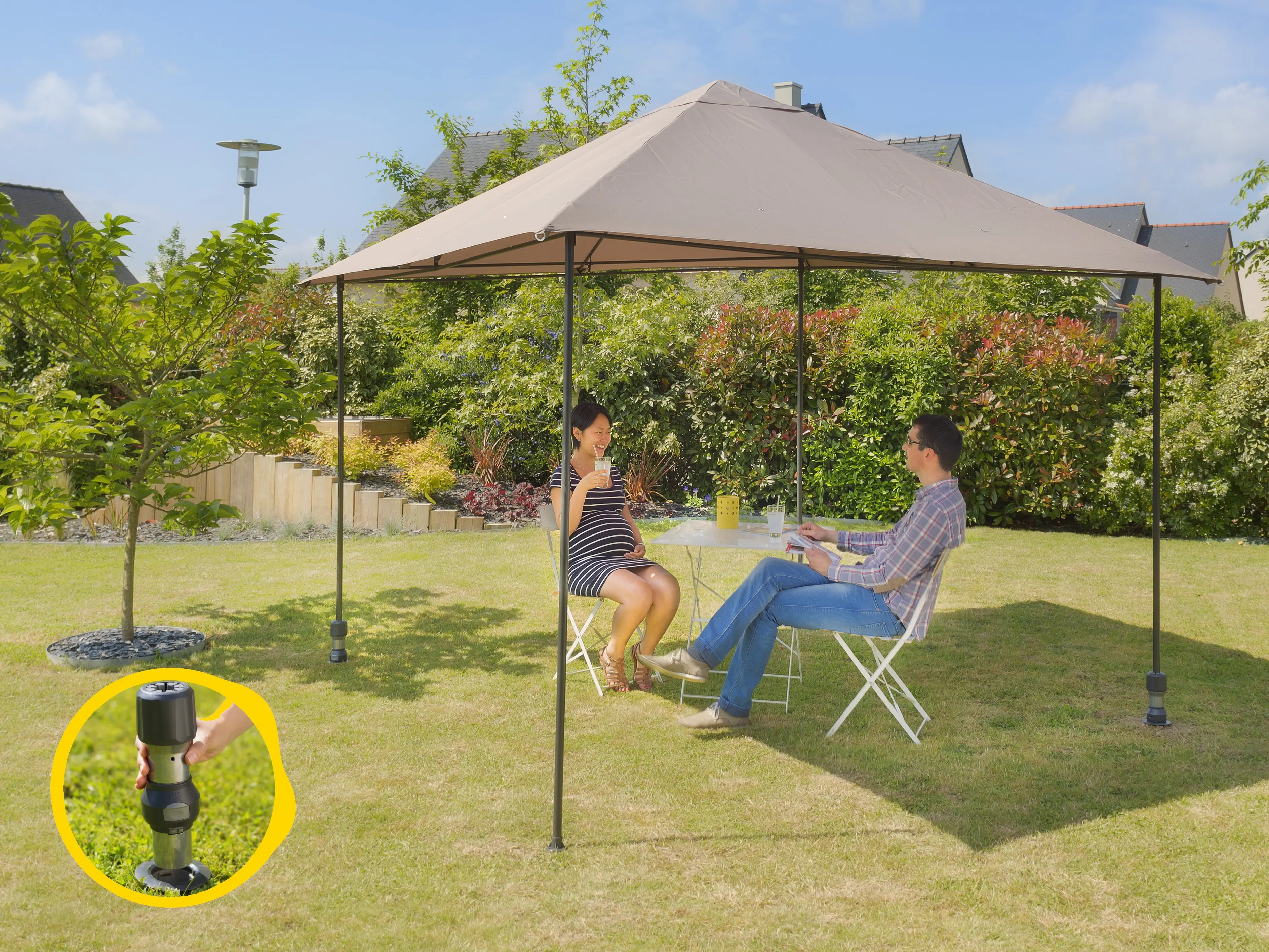 Sobald die Basen installiert sind, lässt sich der Pavillon in wenigen Sekunden aufbauen. Abnehmbar, kann er bei Bedarf leicht demontiert werden, um Platz zu schaffen. Das GARD&ROCK-System ermöglicht zudem die Nutzung derselben Bodenverankerung für weitere Außenprodukte: Sonnensegel, Sonnenschirm, Hängematte oder Sportgeräte.