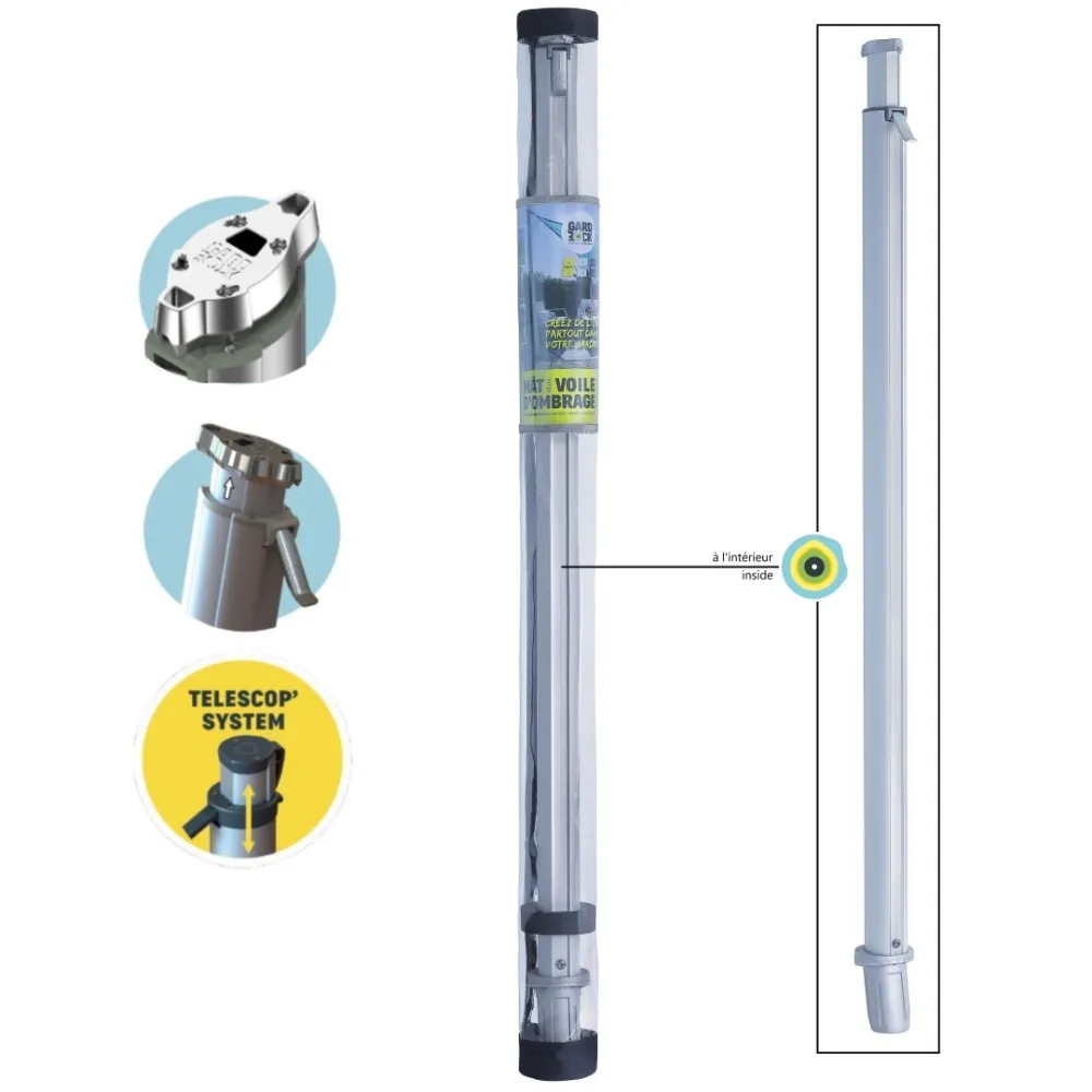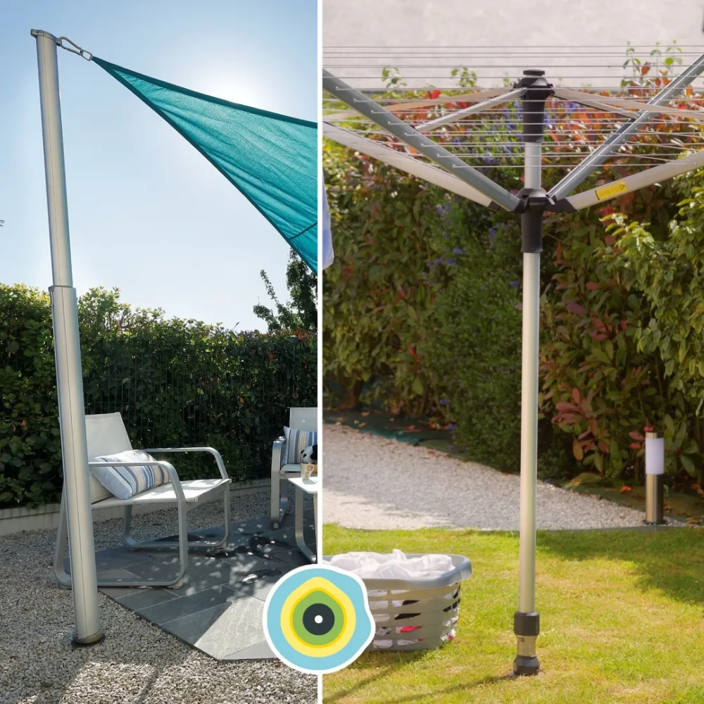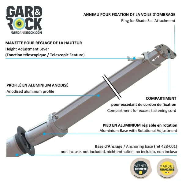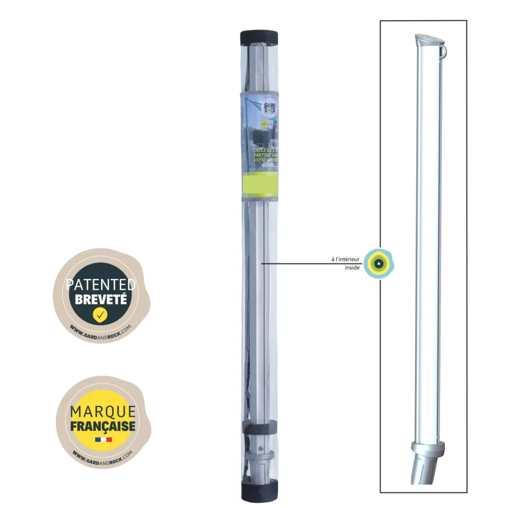 Die GARD&ROCK Pfosten sorgen überall in Ihrem Außenbereich für rasche und einfache Befestigung der Sonnensegel (Terrasse, Rasen, Veranda, Schwimmbad, ...). Unser patentiertes System bietet eine entfernbare Befestigungssystem, damit Ihre Gestaltung moduliert oder Ihr Gelände im Nu wieder freigegeben werden kann. Sie können die Höhe des Teleskopmasts beliebig verstellen. Sie nutzen ein hochwertiges designorientiertes Produkt französischer Konzeption. Ein unerlässliches Zubehör, um angenehme Momente unter optimalen Bedingungen zu verbringen.