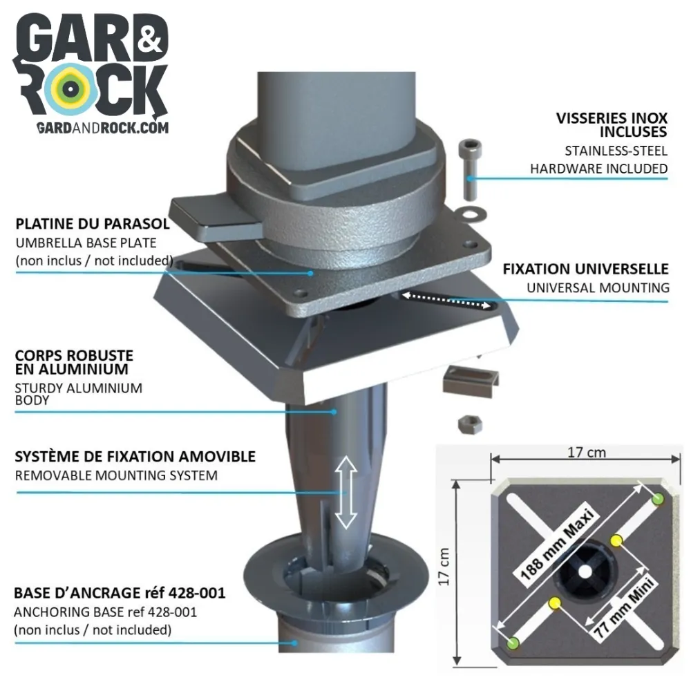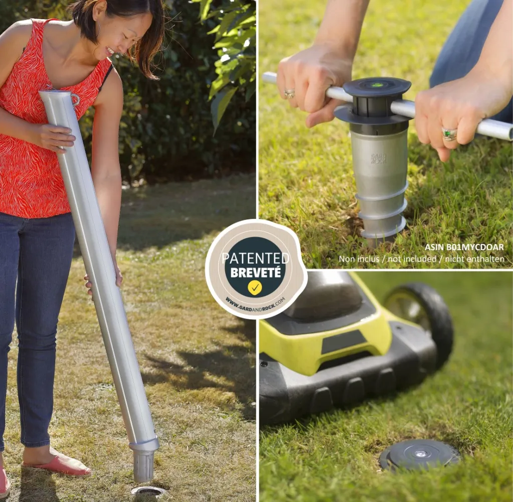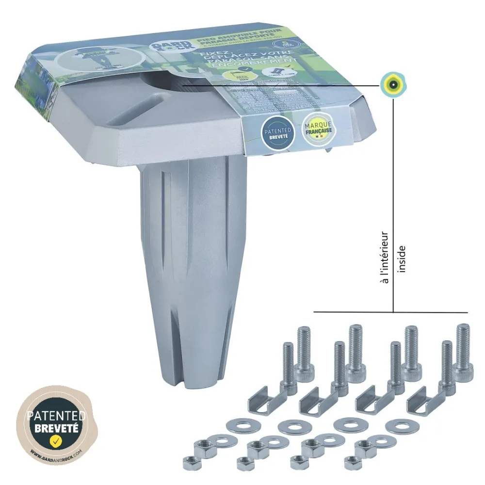 Die Gard&Rock Halterung sorgt für eine stabile und leicht wieder herausnehmbare Bodenbefestigung verschiedenster Outdoor-Ausrüstung (wie Sonnenschirme, Pavillons, Fahnenmasten, Vogelhäuschen, Sportgeräte...). Sie lässt sich einfach in den (separat erhältlichen) Ankerfuß einstecken, wodurch Sie Ihren Außenbereich im Handumdrehen umbauen und frei räumen und so maximal von Ihrem Garten profitieren können.
