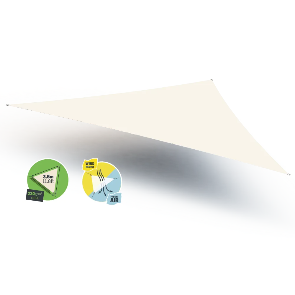 Entscheiden Sie sich für eine effiziente Schattenlösung in ästhetischem Design. Dank der Gard&Rock Sonnensegel in Dreieck in den Abmessungen 3,6*3,6*3,6 m sind Sie vor der Sonne geschützt und setzen in Ihrem Garten gleichzeitig einen dekorativen Akzent. In Kombination mit Masten können Sie so überall in Ihrem Außenbereich schattige Plätze schaffen. Das Sonnensegel aus mikroperforiertem HDPE-Gewebe mit einem Gewicht von 220g/m2 ist qualitativ sehr hochwertig und wird in der Farbe Elfenbein angeboten.