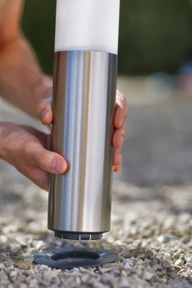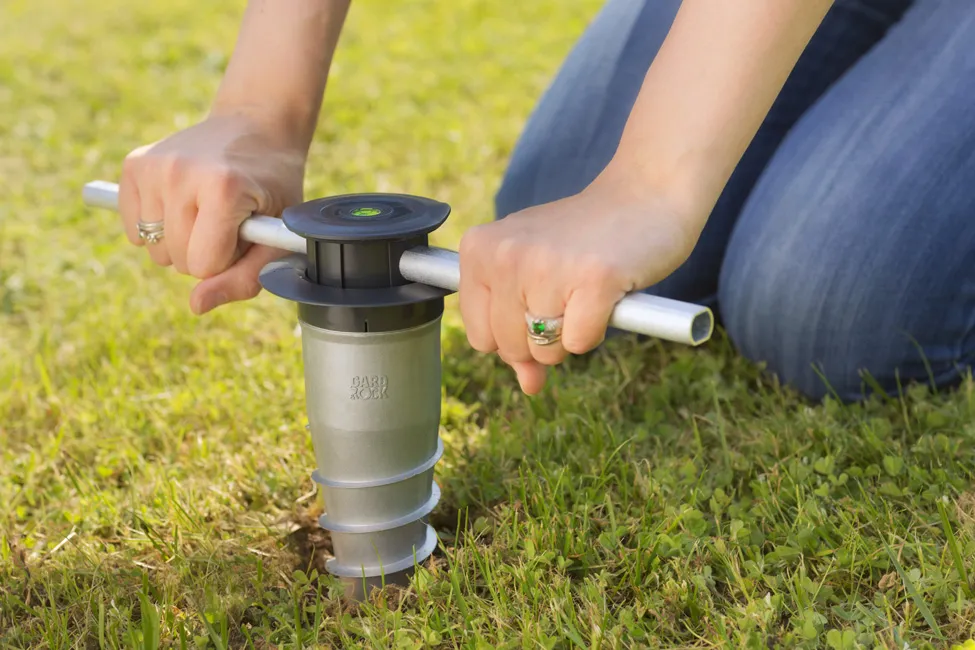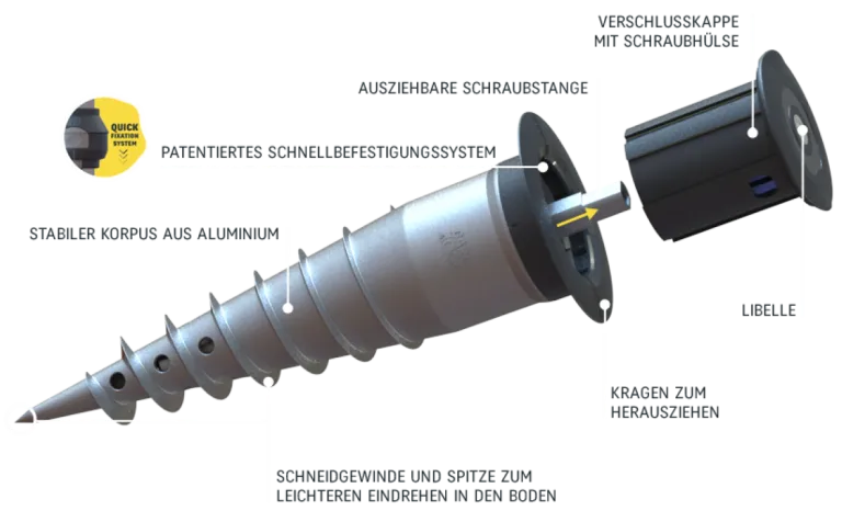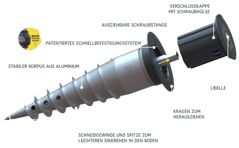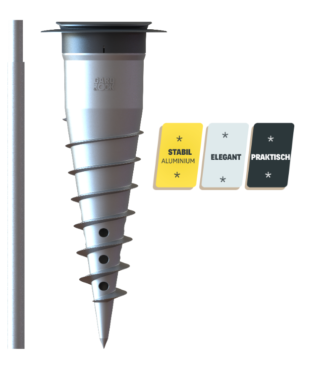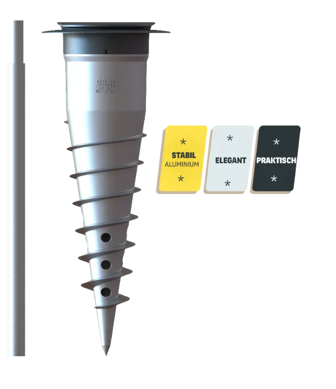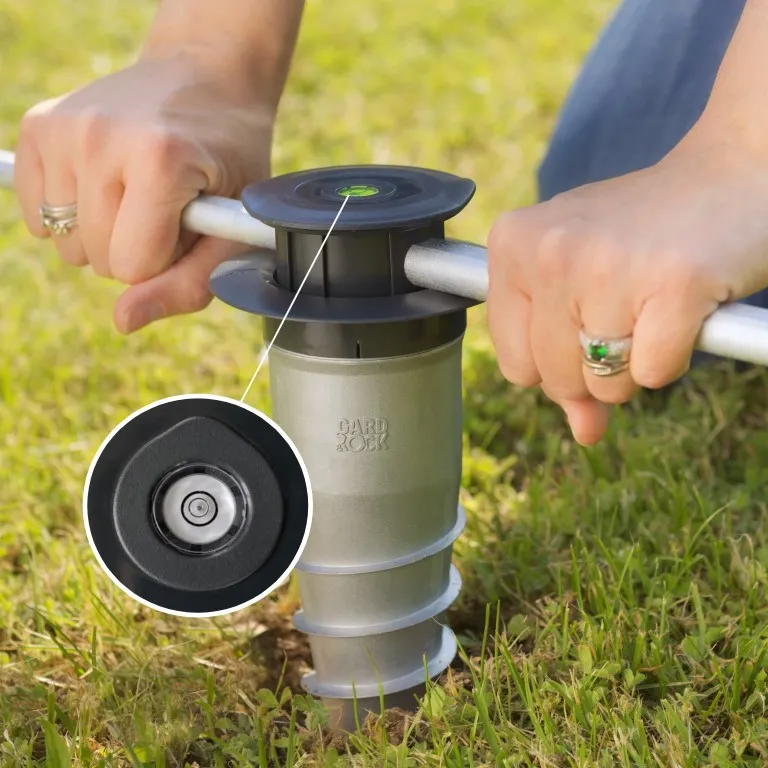 Den Ankerfuß mit dem Schraubeinsatz direkt in den Untergrund schrauben (Rasen, befestigter Boden, Erde, fester Untergrund ...). Die Libelle zeigt auf ebenem und sogar auf abschüssigem Untergrund die vertikale Position präzise an! Auf diese Weise ist sichergestellt, dass hinterher alle Geräte, die Sie einsetzen, auch wirklich gerade stehen. Bei Bedarf und je nach Bodenbeschaffenheit kann der GARD&ROCK-Ankerfuß auch mit Beton vergossen werden. Die einzelnen Schritte sind in der Anleitung beschrieben und wir empfehlen Ihnen, sich zudem dieses Video anzusehen: