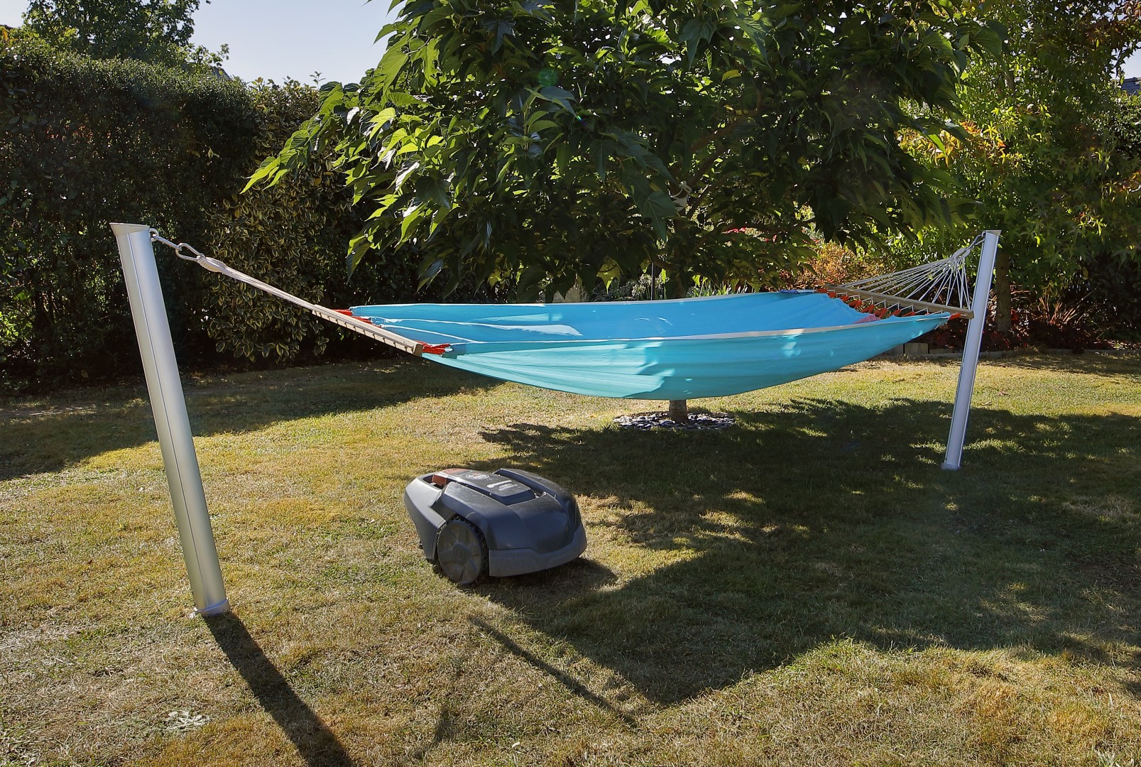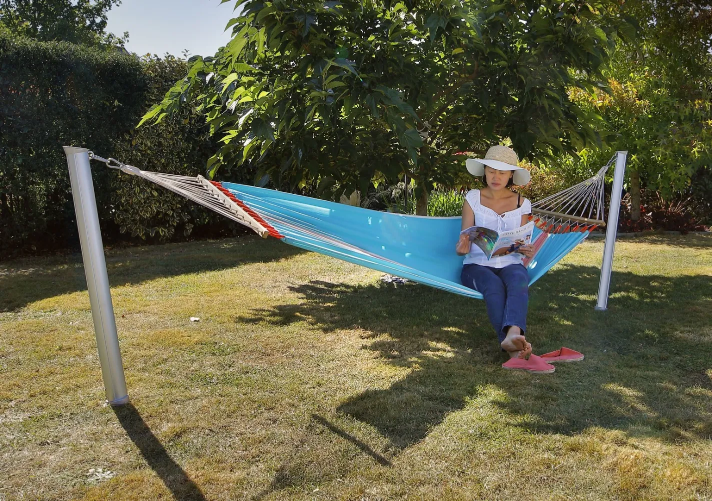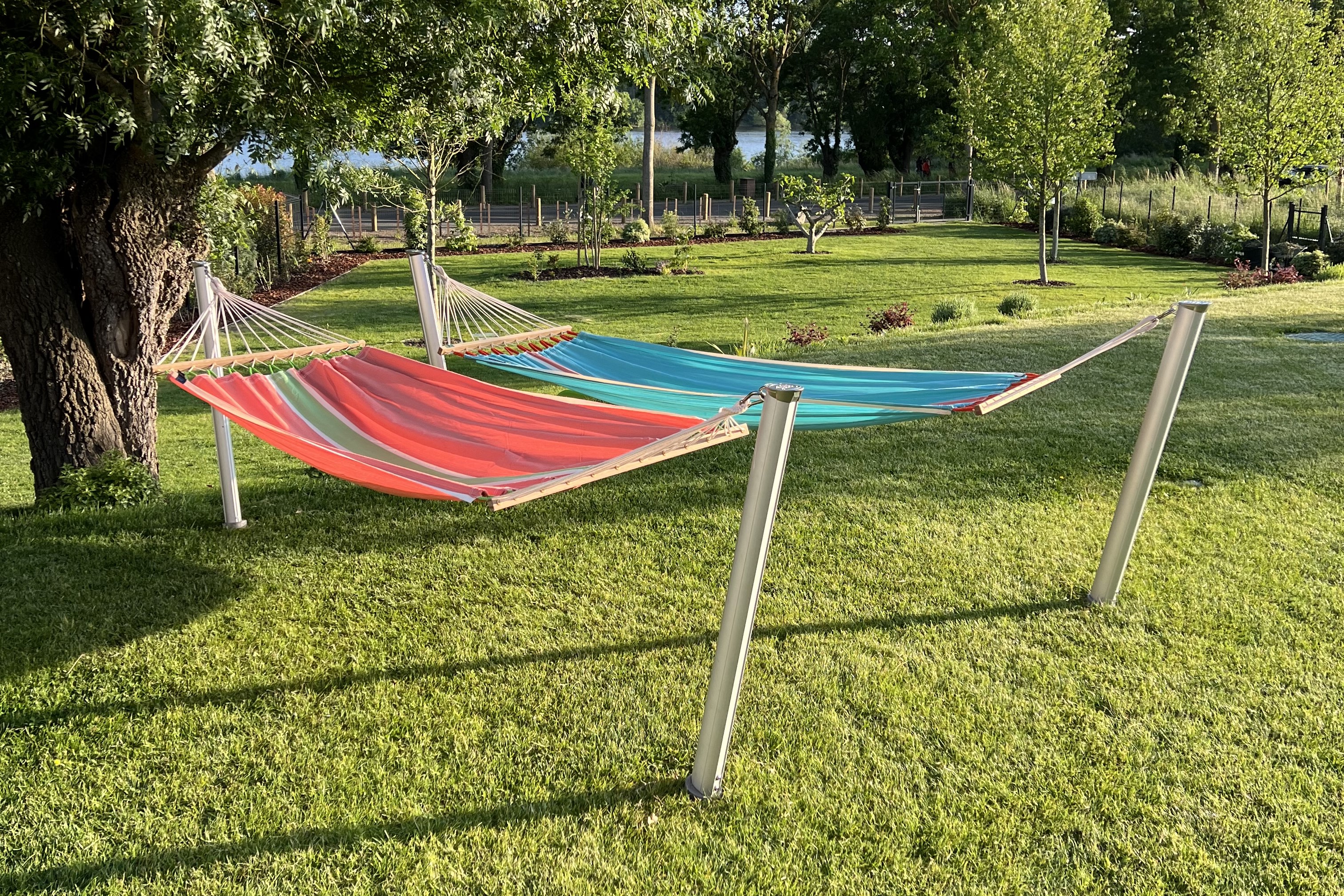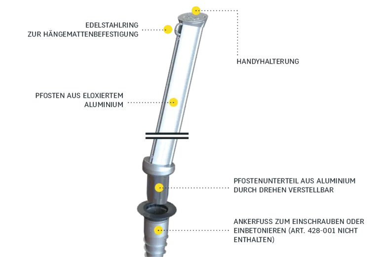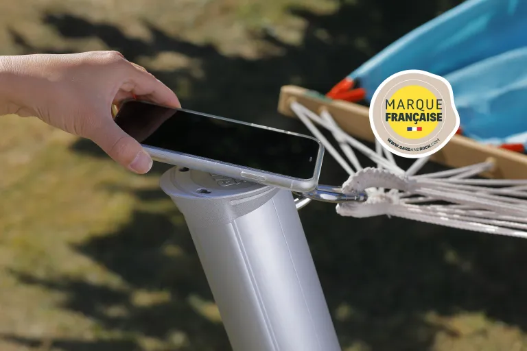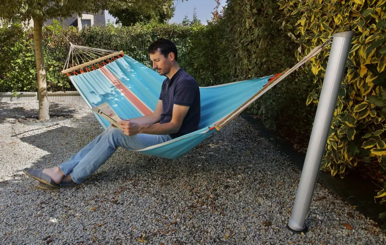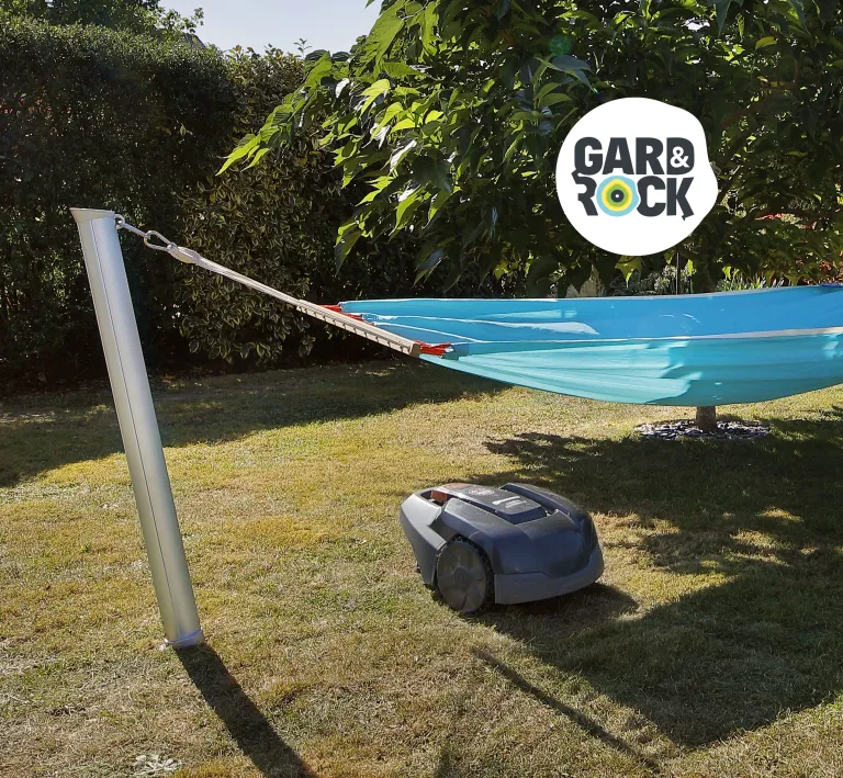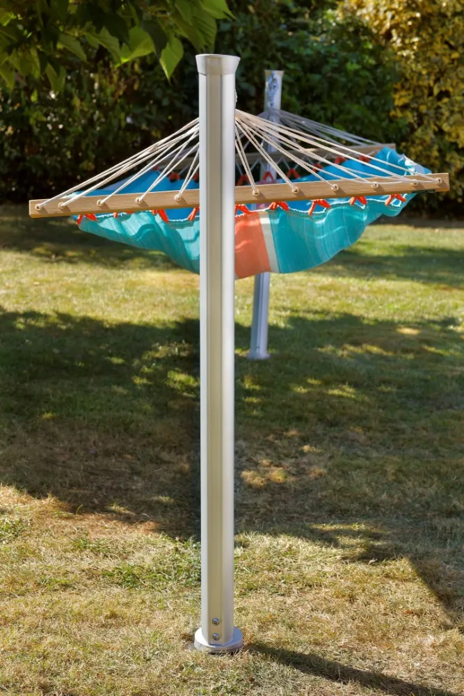 Der in Frankreich entwickelte und aus eloxiertem Aluminium und einer verchromten Legierung gefertigte Gard&Rock Pfosten ist ein auf eine lange Lebensdauer ausgelegter Hängemattenständer (mit einer Tragfähigkeit bis 100 kg, für Einpersonen-Hängenmatten). Die geneigte Position der Pfosten sorgt für extra Stabilität und fügt sich harmonisch in jeden Außenbereich.
