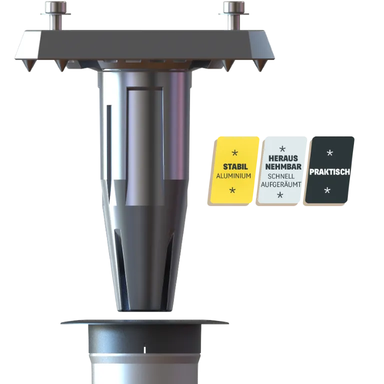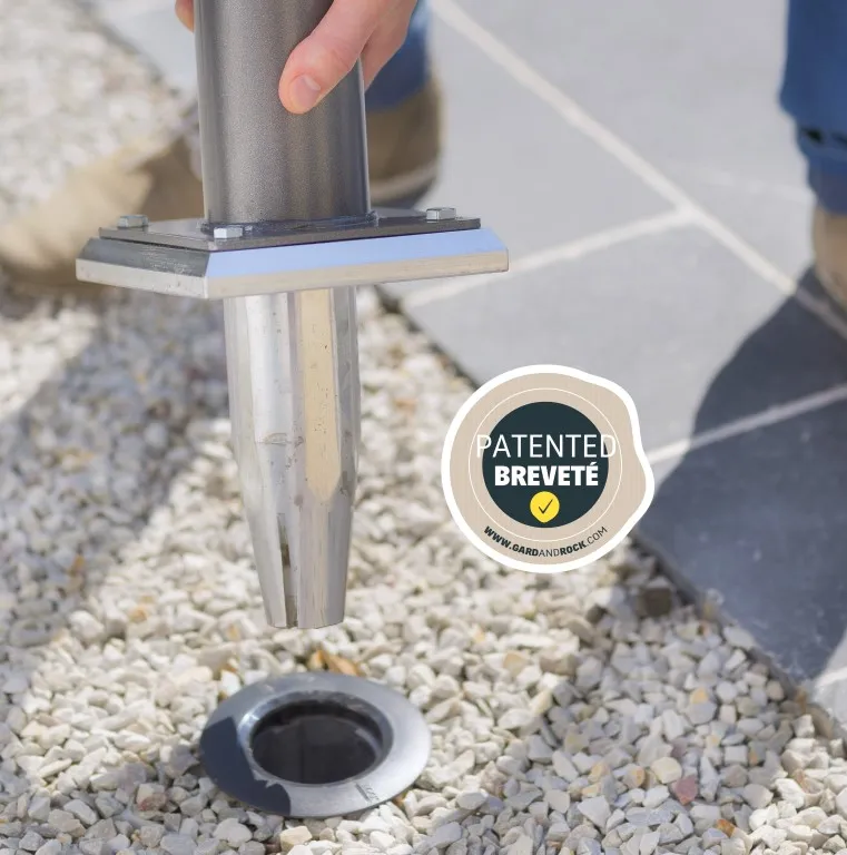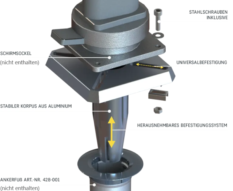 Im Rahmen des exklusiven Gard&Rock Bodenhalterungskonzepts muss  der Mastbefestigungsadapter mit dem Ankerfuß (Art.-Nr. 428-001 separat erhältlich) kombiniert werden. Dieses System sorgt für eine stabile und herausnehmbare Halterung, die ein leichtes Wechseln und Umstellen Ihrer Gartenausrüstung gestattet.
