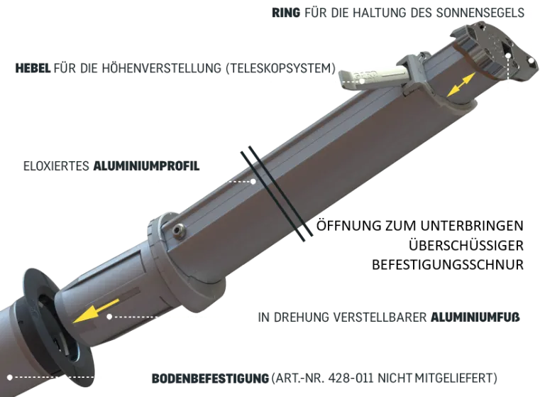 ☛ AUSWAHL DES SONNENSEGELS: Zur leichteren Montage und Maximierung der Lebensdauer der Masten empfehlen wir die Verwendung eines mikro-perforierten (wind- und wasserdurchlässigen) Sonnensegels mit einer Fläche von maximal 12 m² und einer Dichte von bis zu 300 g/m². Sie können so Ihre Sonnensegel bequem anbringen und von einer hochwertigen Beschattung profitieren.